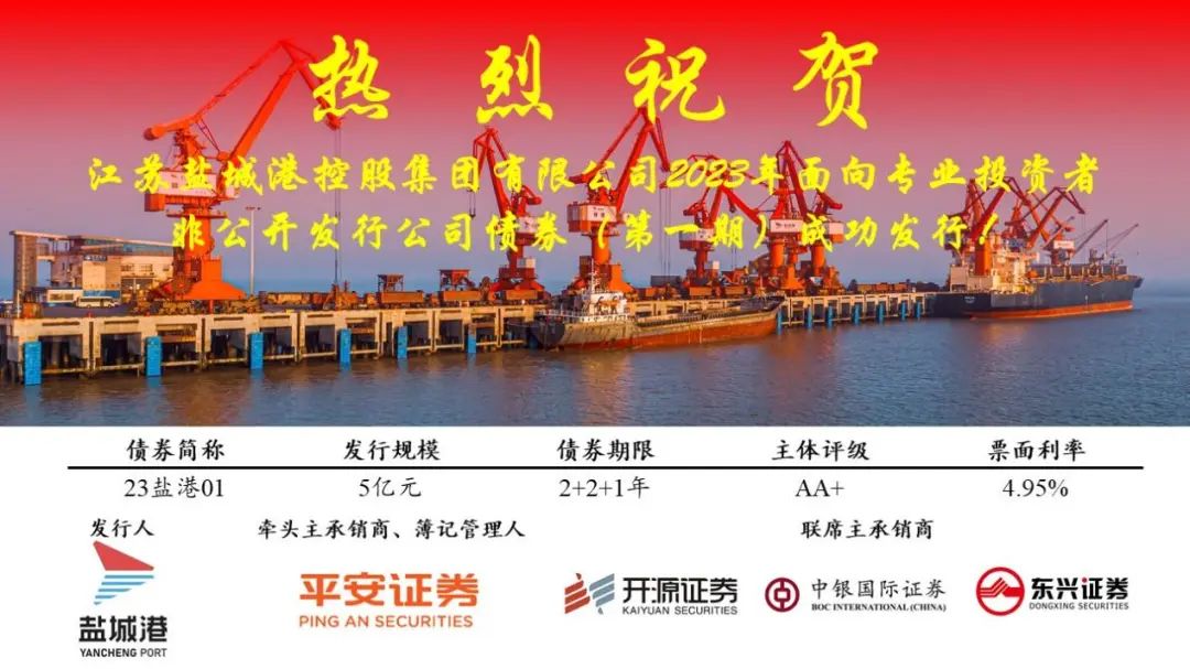 2月23日,鹽城港集團(tuán)2023年度第一期私募公司債成功發(fā)行,金額5億元,發(fā)行利率4.95%。本期私募公司債為集團(tuán)本部私募產(chǎn)品首次公開(kāi)市場(chǎng)亮相,進(jìn)一步提振了金融機(jī)構(gòu)對(duì)鹽城港集團(tuán)發(fā)展的信心,鞏固了集團(tuán)在資本市場(chǎng)的口碑與信譽(yù)。