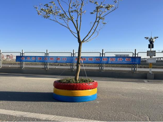 針對地磅站臺位置地處碼頭邊緣的現(xiàn)狀,為有效防止車輛在運輸或掉頭拐彎過程中,誤闖碼頭或誤滑海域等安全隱患,開展“修舊利廢”行動,誤闖碼頭或誤滑海域等安全隱患,踐行“修舊利廢”行動,利用2套支座、4根Φ40的廢舊鋼絲繩,支座選用預埋定位螺栓,高標號水泥澆筑固定,制作一套安全防護車擋;利用廢舊輪胎循環(huán)制作路邊安全警示“盆景”;聚焦修舊利廢“小舉措” 實現(xiàn)提質(zhì)增效“大提升”。