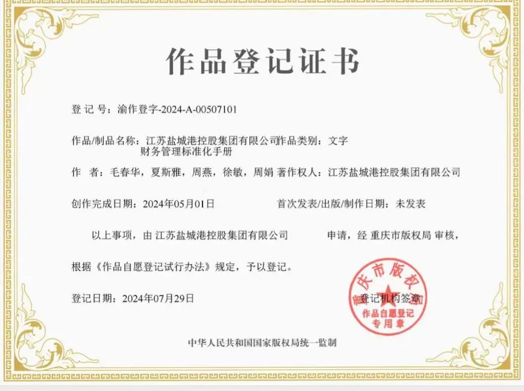 近日,鹽城港集團自主編制的《財務(wù)管理標準化手冊》經(jīng)過嚴格審核與認證,成功取得了由國家版權(quán)局頒發(fā)的作品登記證書。這不僅是集團在財務(wù)精細化管理方面的積極探索,也是集團對財務(wù)管理標準化的創(chuàng)新實踐。